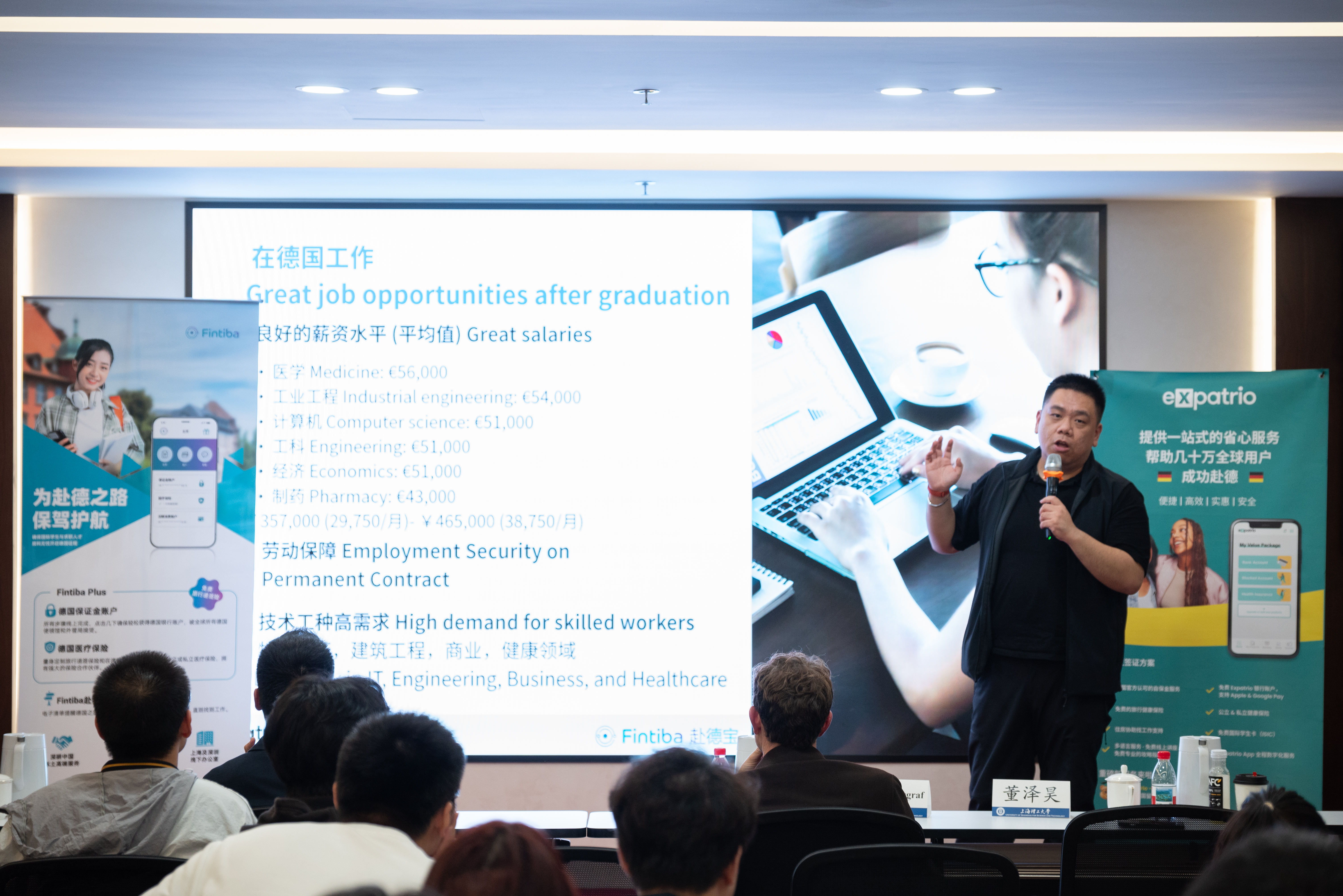 围绕留学准备阶段最受关注的签证申请流程,董泽昊先生(Zehao Dong)进行了系统讲解。他详细梳理了签证申请的时间规划与关键步骤,重点介绍了自保金帐户的开立流程、资金管理及提款规则,为计划赴德的同学提供了实用指导。在谈及赴德后的学习与生活时,董先生还分享了德国留学生的就业政策与奖学金项目。他提到,毕业后留学生可享有18个月的求职过渡期,同时Fintiba也设有专门面向中国学生的奖学金计划,鼓励大家积极探索在德发展的多种可能性。此外,他就德国的强制医疗保险制度进行了介绍,并以公立保险机构TK为例,说明其保障范围涵盖门诊、药品、住院及牙科护理等方方面面,为同学们在德生活提供了全方位的健康支持。