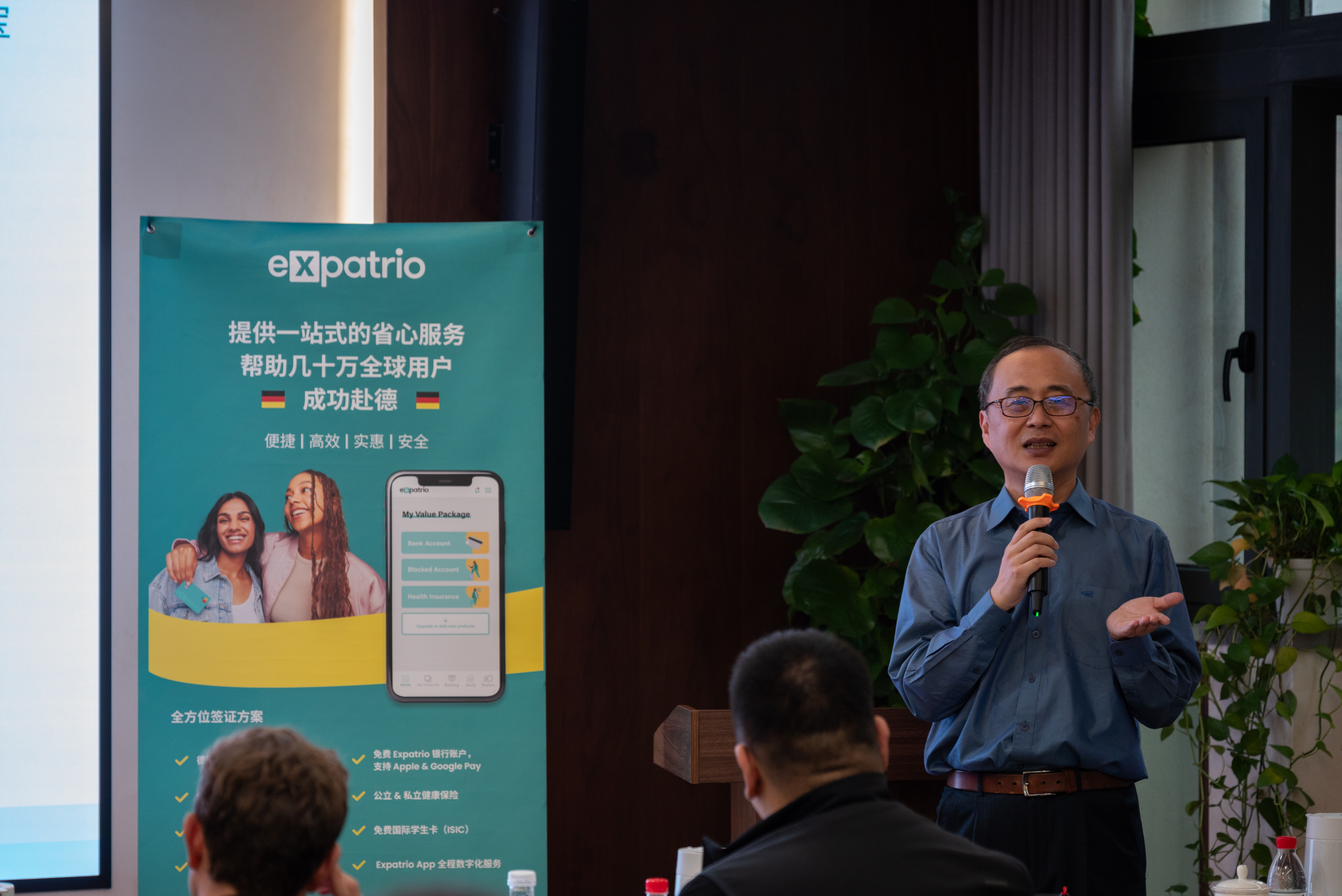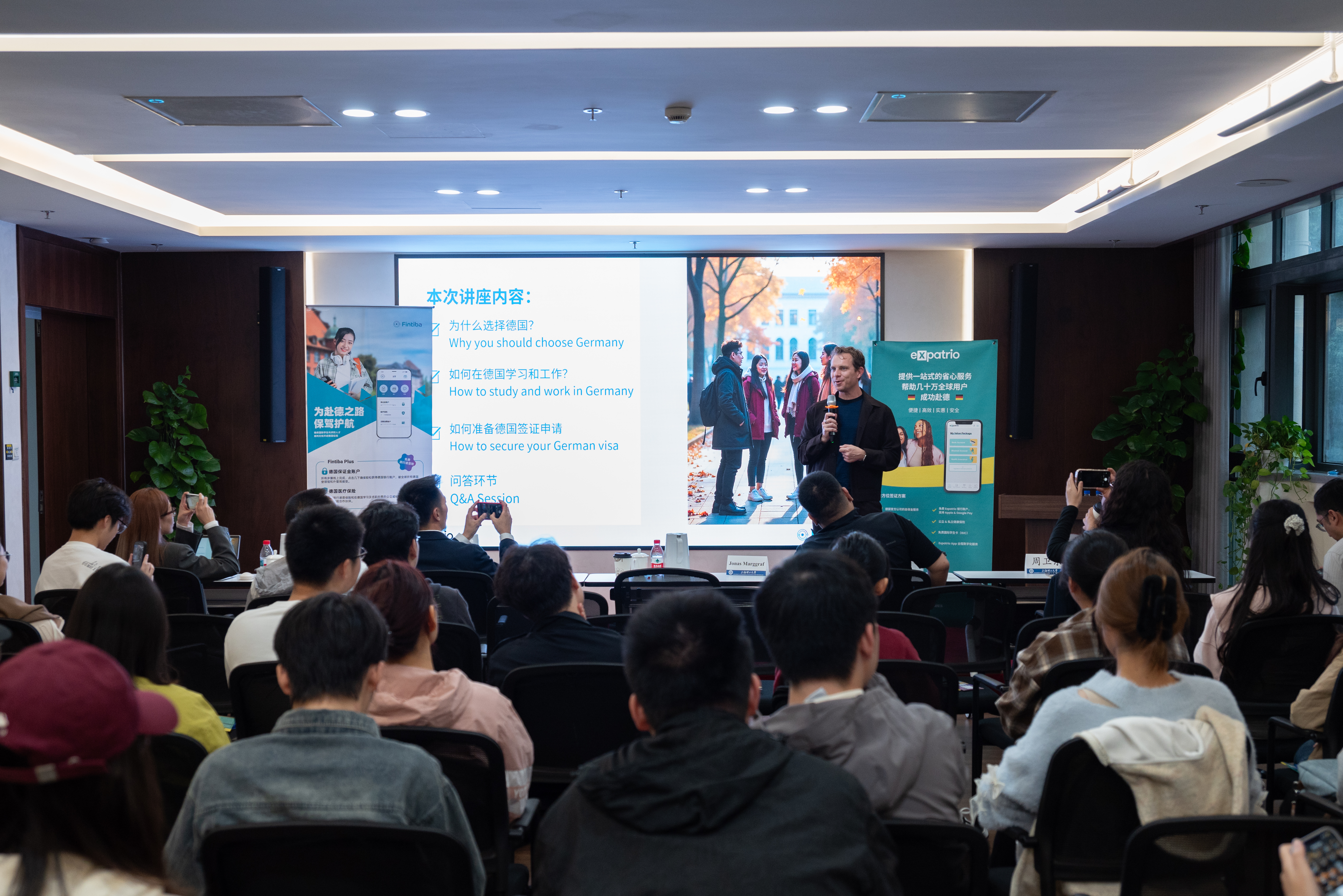 在分享环节,Jonas Marggraf先生以“为什么选择德国”为主题,从教育质量、就业前景和生活成本三大方面全面阐述了德国留学的独特优势。他指出,德国公立大学的免学费政策及工科教育的世界领先地位,使其成为众多国际学生心目中的“高性价比留学目的地”。随后,石柱(Stone Shi)先生结合自身的求学与工作经历,进一步介绍了德国高校的国际化水平及其在机械、汽车、化工等产业领域的优势,强调了留学生在德国广阔的职业发展空间。